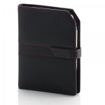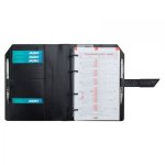 Levá vnitřní strana desek: 8 horizontálních přihrádek na kreditní karty, 2 vertikální kapsy po celé délce diáře. Poutko na pero s mikrotužkou ADK.