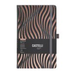 Zápisník z kolekce Rose od Castelli Milano 1938 v sobě spojuje odvážný design a sofistikované řemeslné zpracování. Dýmově šedý podklad zvýrazňuje křivky růžově zlatého metalického vzoru, který se na povrchu vlní jako hedvábná stuha a mění se v závislosti na světle a úhlu pohledu. Obálka je vyrobena z exkluzivního materiálu na bázi polyuretanu, bez obsahu PVC, s jemným sametovým povrchem a termoreaktivním efektem.