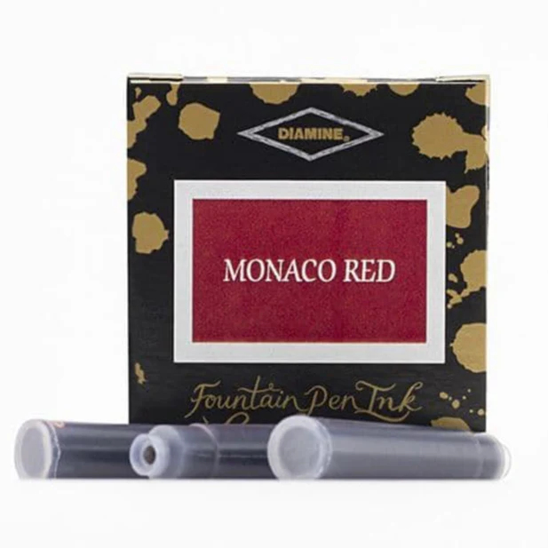 Inkoustové bombičky Diamine v barvě Monaco Red - odstín červené. Inkoust v nich je na vodní bázi. Balení obsahuje 6 ks bombiček. Vyrobeno v Anglii.