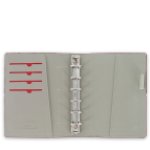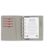 Levá vnitřní strana desek: 4 horizontální kapsy, pod nimi otevřená šikmo střižená vertikální kapsa po celé délce diáře.