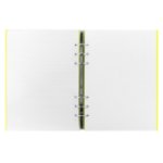 Kvalitní zápisník Clipbook Saffiano Fluoro ve velikosti A5 se strukturovaným povrchem desek ve žluté barvě a kroužkovou vazbou od tradiční anglické značky Filofax. Tento poznámkový blok s klasickou kovovou kroužkovou vazbou Filofax umožňuje vyjmout a zpět vrátit listy, možné je přehnout desky o 360°. Velikost je 212 x 185 x 28 mm. Průměr kroužkové vazby 25 mm.