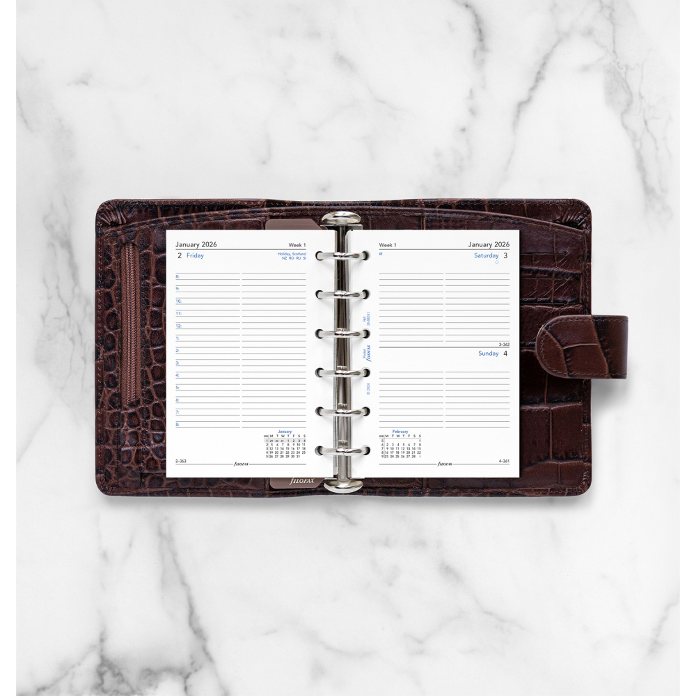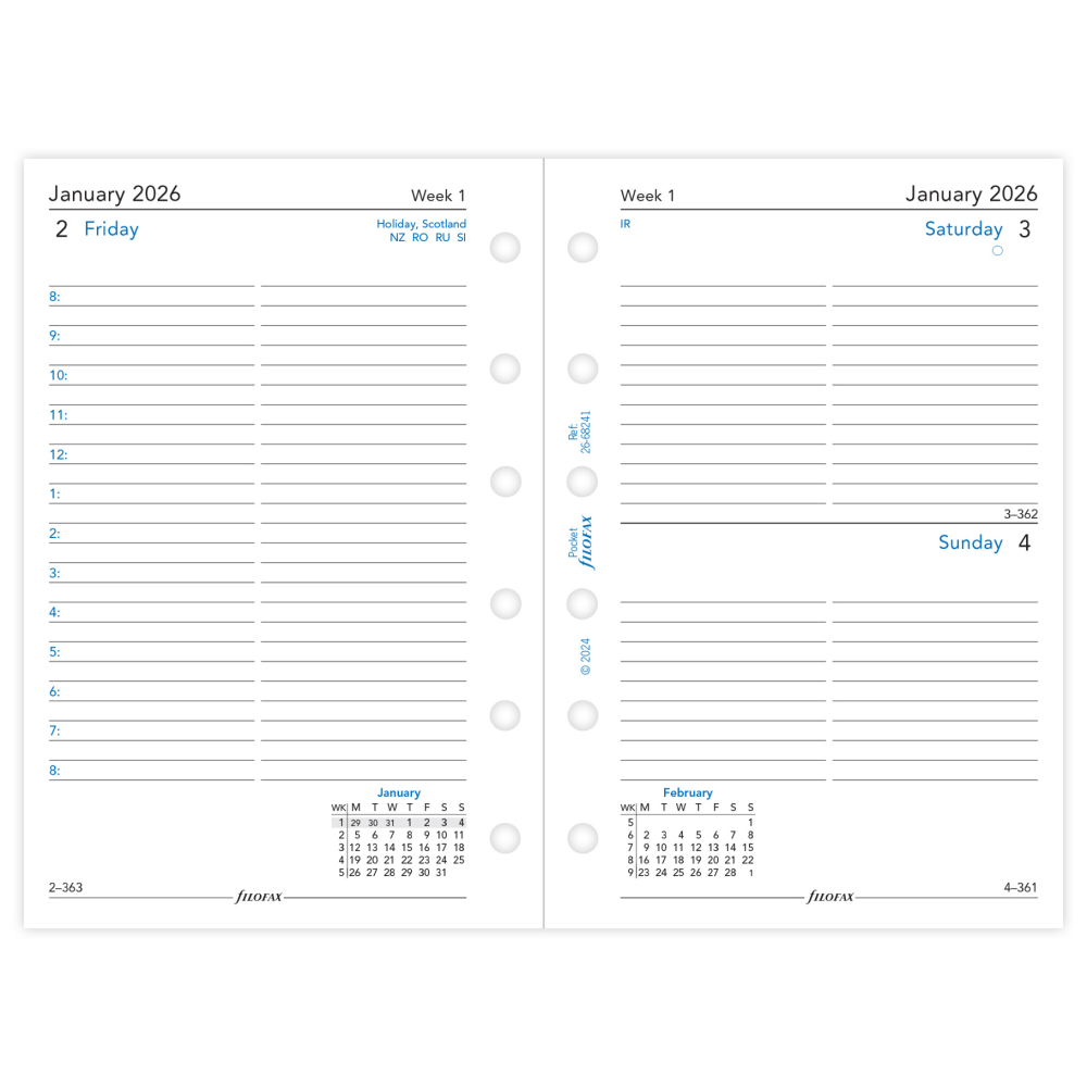 Anglický kalendář 2026 den na 1 stránku pro diáře Filofax o velikosti Pocket - kapesní. Sobota a neděle jsou na 1 straně. Formát papíru 120 x 81 mm.