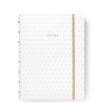 Zápisník Filofax ve velikosti A5 z kolekce Moonlight s pevnými deskami v bílém provedení s kontrastní vnitřní stranou desek a s detaily ze zlaté fólie. Tento poznámkový blok umožňuje vyjmout a zpět vrátit listy nebo třeba přehnout desky o 360°. Součástí balení je 56 linkovaných listů gramáže 100 g/m2, který je vhodný i pro plnicí pera. Pružná gumička ve zlaté barvě pro uzavření zápisníku. Velikost je 214 x 164 mm.