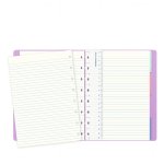 Kvalitní pastelově fialový zápisník ve velikosti A5 s příjemným povrchem desek připomínající kůži od tradiční anglické značky Filofax. Tento poznámkový blok umožňuje vyjmout a zpět vrátit listy nebo třeba přehnout desky o 360°. Součástí balení je 56 linkovaných listů gramáže 100 g/m2, 4 čtverečkované a 4 čisté listy, 4 barevné rozdělovníky s kapsičkou a průhledné pravítko. Pružná gumička pro uzavření zápisníku. Velikost je 214 x 161 mm.