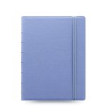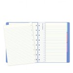 Kvalitní pastelově modrý zápisník ve velikosti A5 s příjemným povrchem desek připomínající kůži od tradiční anglické značky Filofax. Tento poznámkový blok umožňuje vyjmout a zpět vrátit listy nebo třeba přehnout desky o 360°. Součástí balení je 56 linkovaných listů gramáže 100 g/m2, 4 čtverečkované a 4 čisté listy, 4 barevné rozdělovníky s kapsičkou a průhledné pravítko. Pružná gumička pro uzavření zápisníku. Velikost je 214 x 161 mm.