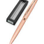 Elegantní kovové kuličkové pero Online Eleganza s lakovanou povrchovou úpravou v barvě růžového zlata v kombinaci s leštěnými doplňky, zdobené liniemi. Otočný mechanismus pro vysunutí velkokapacitní náplně. Dodáváno v papírové krabičce.