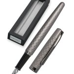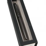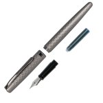 Elegantní kovové plnicí pero Online Eleganza s lakovanou povrchovou úpravou v šedé titanové barvě, v kombinaci s leskle lakovanými doplňky a zdobené liniemi. Hrot je z nerez oceli a má iridiovou špičku. Šířka hrotu M - střední. Víčko je nasazovací. Pero je vybavené systémem na bombičky i na plnění konvertorem, který není součástí balení. Dodáváno v papírové krabičce.