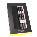 Sada elegantního kovového plnicího a kuličkového pera Online Eleganza s lakovanou povrchovou úpravou ve vínové barvě, v kombinaci s leskle lakovanými doplňky a zdobené liniemi. Plnicí pero Online Eleganza má hrot z nerezové oceli s iridiovou špičkou. Šířka hrotu M - střední. Víčko je nasazovací. Pero je vybavené systémem na bombičky i na plnění konvertorem, který není součástí balení. Kuličkové pero je vybaveno otočným mechanismem pro vysunutí velkokapacitní náplně. Součástí balení jedna bombička a jedna náplň do kuličkového pera. Dodáváno v papírové krabičce s pouzdrem.