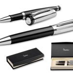Sada kuličkového a keramického pera. Těla per jsou černá, vrchní části jsou pochromované a zdobené jemnou dekorací. Dodáváno v dárkové krabičce.