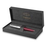 Kuličkové pero Parker 51 Burgundy CT má tělo z ušlechtilé vínově červené pryskyřice. Víčko z nerezové oceli. Korunka a doplňky jsou pokoveny palladiem. Otočný mechanismus pro vysunutí náplně. Součástí balení černá náplň. Dodáváno v elegantní dárkové krabičce.