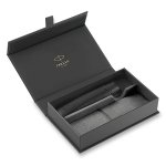 Dárková kazeta s černým pouzdrem z umělé kůže, určená pro jedno pero značky Parker. Stylové otevřené pouzdro nese logo výrobce a jeho rozměry jsou 16 × 3,8 × 1,5 cm.