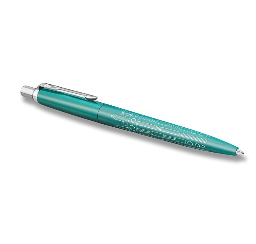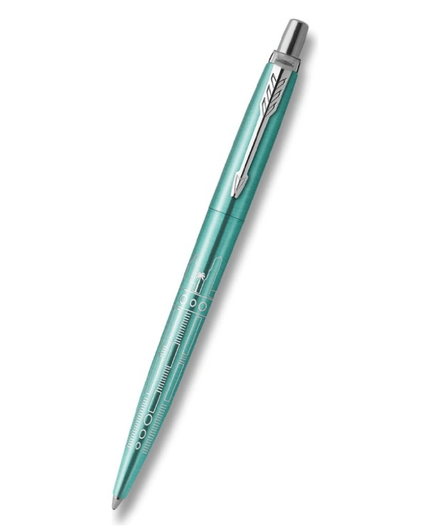 Parker Jotter Miami ze speciální edice má tyrkysové lakované tělo zdobené vzorem panoramatu města Miami. celý popis