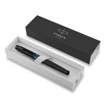 Keramické pero Parker Royal I.M. Vibrant Rings Marine Blue má matně černé tělo a víčko s výraznými barevnými prstenci modré barvy. Doplňky jsou potažené pomocí techniky PVD matně černou vrstvou. Víčko je nasazovací. Standardně je v balení 1 náplň. Dodáváno v elegantní dárkové krabičce.