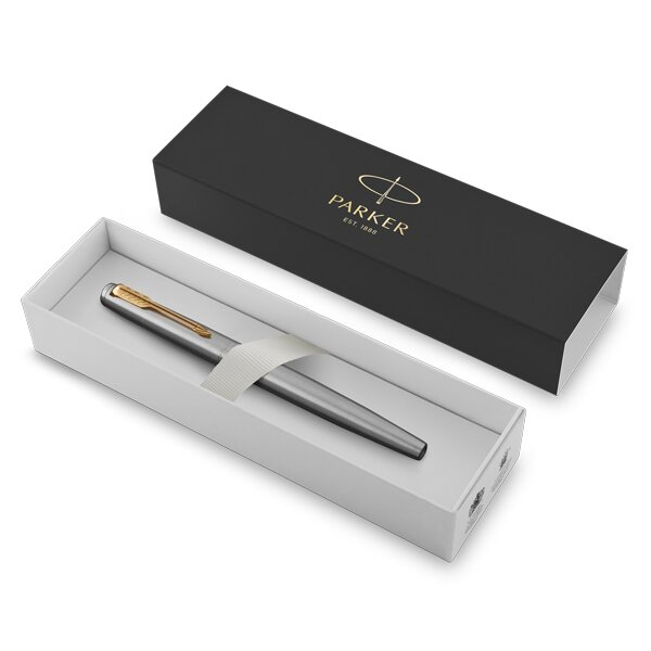 Pero Jotter Stainless Steel GT má tělo z broušené nerezové ocele, které vytváří vkusný kontrast s klipem pokoveným zlatem. Hrot je vyroben z nerezové oceli. V nabídce pouze hrot M (střední). Víčko je nasazovací. Pero je vybavené systémem na bombičky i na plnění konvertorem. Dvoukanálový systém zásobování hrotu inkoustem, konvertor není součástí balení. Součástí balení modrá bombička. Dodáváno v elegantní dárkové krabičce.