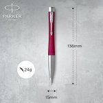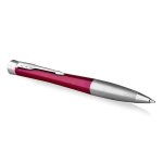 Kuličkové pero Parker Urban Twist Vibrant Magenta CT má broušené mosazné tělo purpurové barvy s lakovanou povrchovou úpravou. Úchop je kovový. Doplňky jsou pokovené chromem. Otočný mechanismus pro vysunutí náplně. Součástí balení jedna modrá náplň. Dodáváno v elegantní dárkové krabičce.