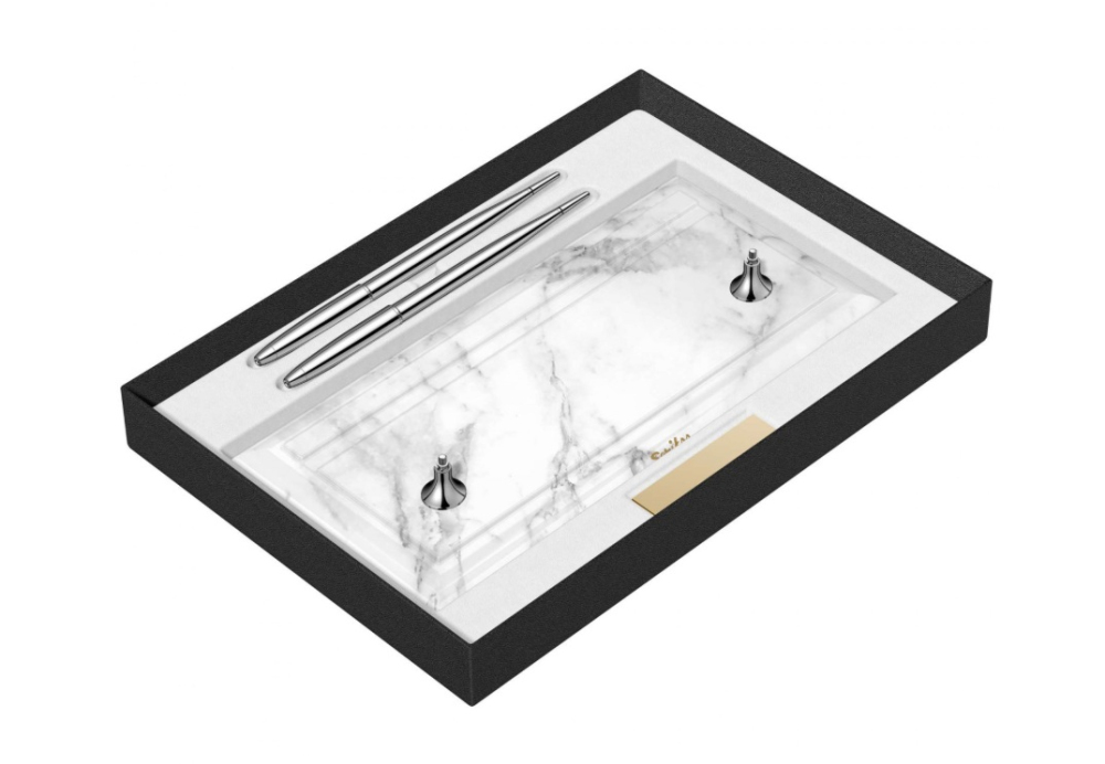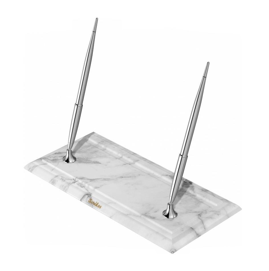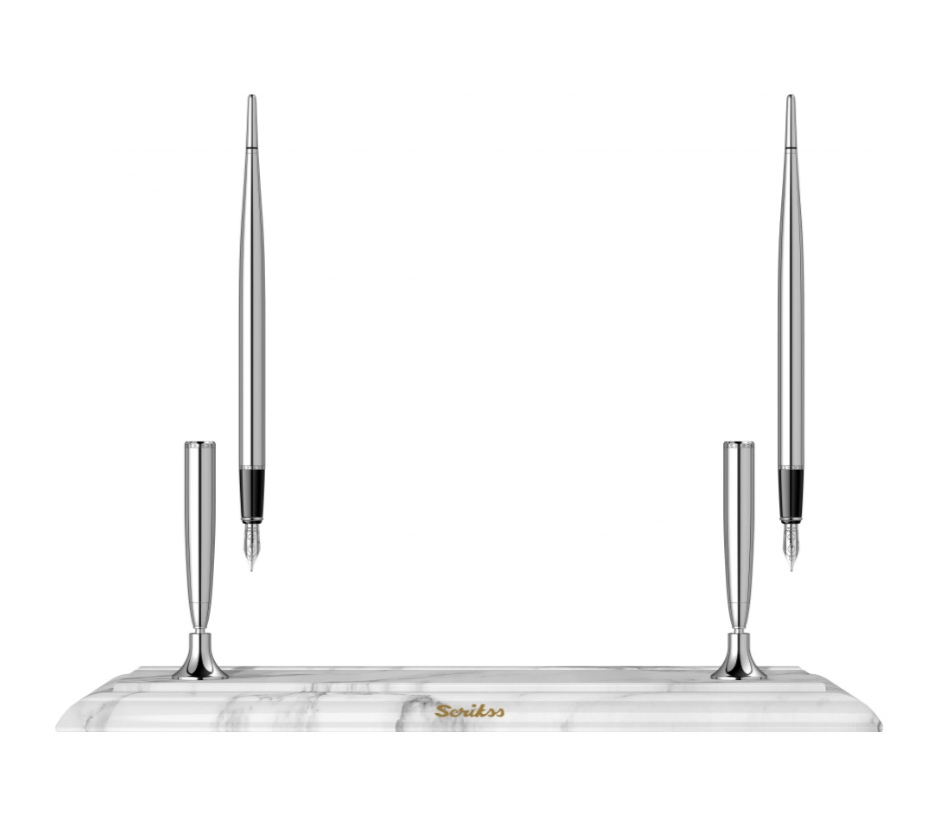 Elegantní a moderní stolní set plnicích per se základnou z bílého mramoru. Pera jsou vyrobena z mosazi a pokovená chromem. Mají nerezový hrot pokovený chromem s iridiovou špičkou v šířce M - střední. Pera jsou vybavené systémem na bombičky i na plnění konvertorem. Standardně jsou v balení bombičky i konvertor. Set je vhodný na recepce firem, hotelů a do kanceláří. Dodáváno v dárkové krabičce s logem Scrikss.