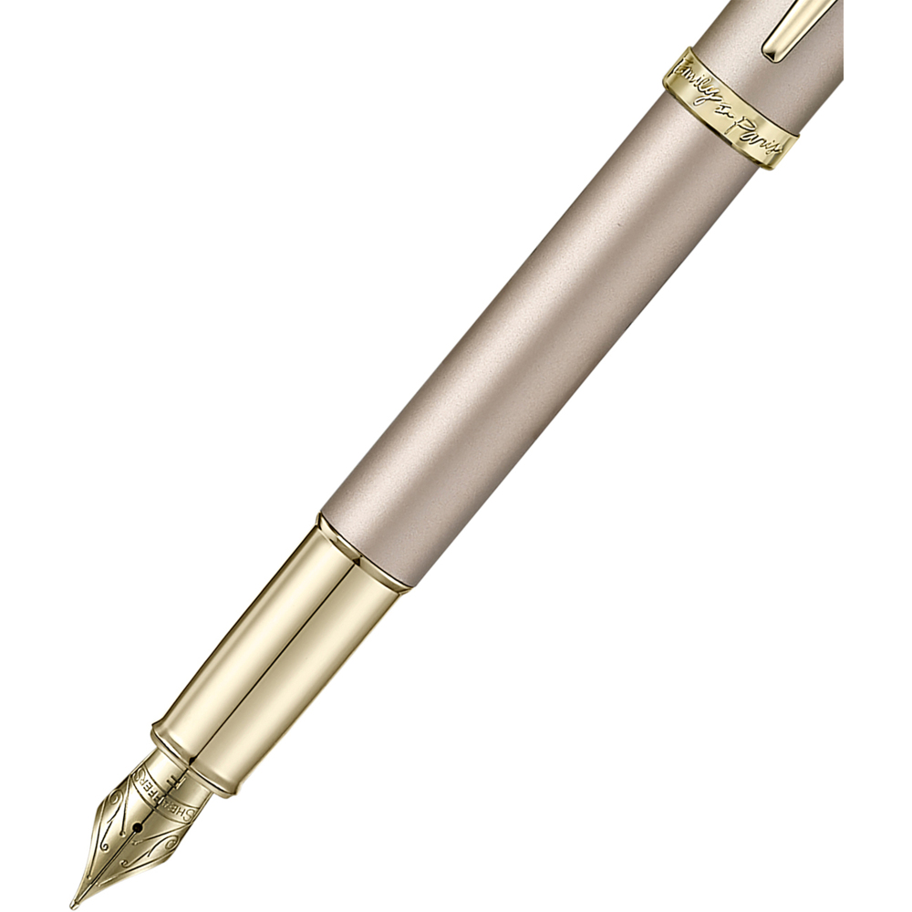 Sheaffer 100 Champagne Emily in Paris GT je jako malý šperk. Stylové plnicí pero v barvě šampaňského se zlatými detaily je ódou na nenucenou pařížskou eleganci – bez zbytečné námahy, zato s plnou pozorností okolí. Hrot je vyrobený z nerezové ocele a je pokovený technikou PVD zlatou barvou. Víčko je nasazovací. Součástí balení je bombička a konvertor. Na klipu se blyští kovová mašle, nechybí Eiffelovka a decentní logo Emily in Paris. Klasická silueta pera se změnila v designový kousek, co má sběratelskou hodnotu, ale také se s ním dobře píše. Hladce, spolehlivě, s tím správným „flow“ pro podpisy, zápisky i vzkazy, které nezapadnou. Díky celokovovému mosaznému tělu vydrží i náročnější pracovní tempo. Bonus? Pěkná dárková krabička s květinovým vzorem.