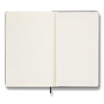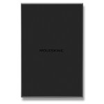 Ručně vázaný zápisník Moleskine má pevnou, ve hřbetě šitou vazbu. Obepíná jej pružná černá páska proti samovolnému otevírání. Obsahuje také praktickou vnitřní kapsu na vizitky a drobnosti vyrobenou z tkaniny a kartonu, textilní záložku a anglický leták s historií značky Moleskine. Rozměrově je zápisník ve velikosti L (13 x 21 cm, A5) a obsahuje 80 linkovaných stránek. Gramáž papíru je 70 g/m2, neobsahuje kyseliny.